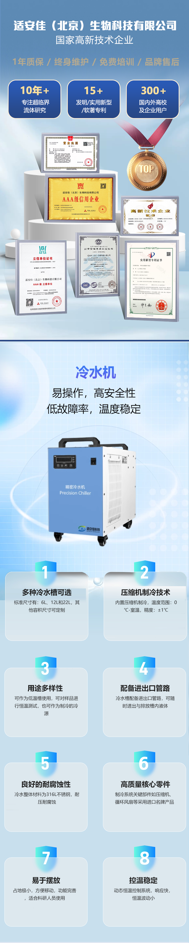 本機是通過壓縮機進行制冷, 再與水進行熱交換, 使水的溫度降低, 通過循環泵送出。同時使用溫度控制器進行溫度控制,具備恒溫、冷卻、循環的三種功能。也當作冷槽使用。